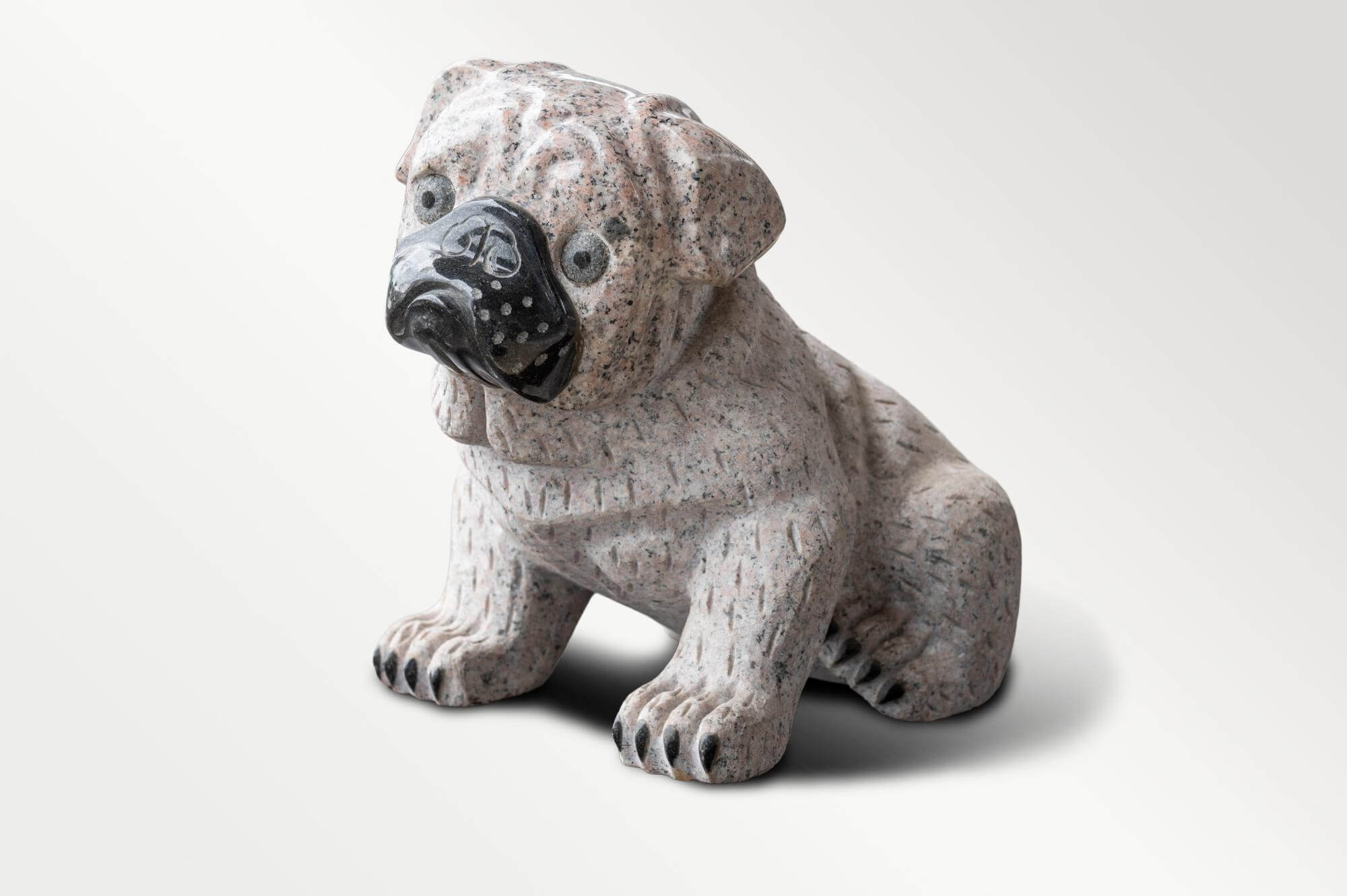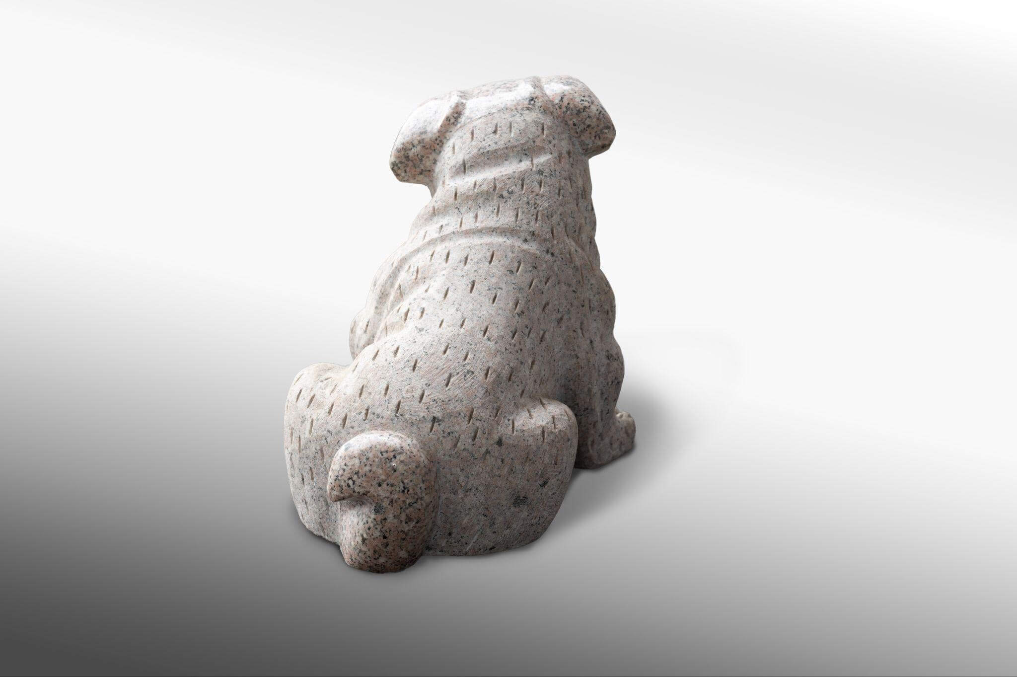首元のたるみや脚の筋肉のライン、そしてパグの魅力である「困り顔」まで、細部にわたって石の表情を活かしながら表現されています。黒い鼻先や爪のディテールなど、異なる石の色味や彫り込みを使い分けることで、単なる石像を超えた生き生きとした躍動感が宿っています。